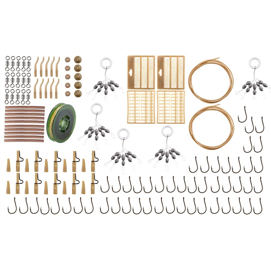 Boilie Rig Binde Set. Alles für den Bau von Boilie Rigs. Im Set enthalten: Karpfenwirbel 3 Packungen a 5 Stück, Aligner Sleeves 1 Packung a 10 Stück, Softperlen 5+7mm 1 Packung a 10 Stück, Bleiclip strong 2 Packungen a 5 Stück, Boliestopper Standard 2 Packungen, Boiliestopper 3 Längen 2 Packungen, Siliconschlauch 2mm 1m 2 Packungen, Bleistopper Gr: M 4 Packungen a 10 Stück, Bleistopper Gr: L 1 Packung a 10 Stück, Vorfachschnur 15m 1 Packung, Schrumpfschlauch 1 Packung a 10 Stück, Boliehaken Gr: 2 1 Packung a 25 Stück, Boliehaken Gr: 4 1 Packung a 25 Stück.